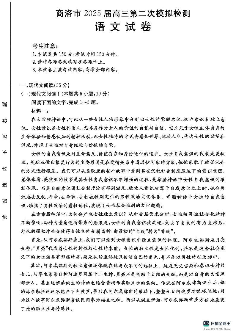 陕西省商洛市2024-2025学年下学期2月高三第二次模拟考试语文