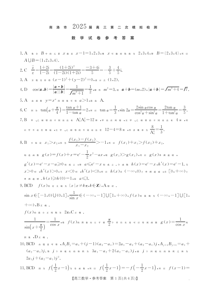 陕西省商洛市2024-2025学年下学期2月高三第二次模拟考试数学答案