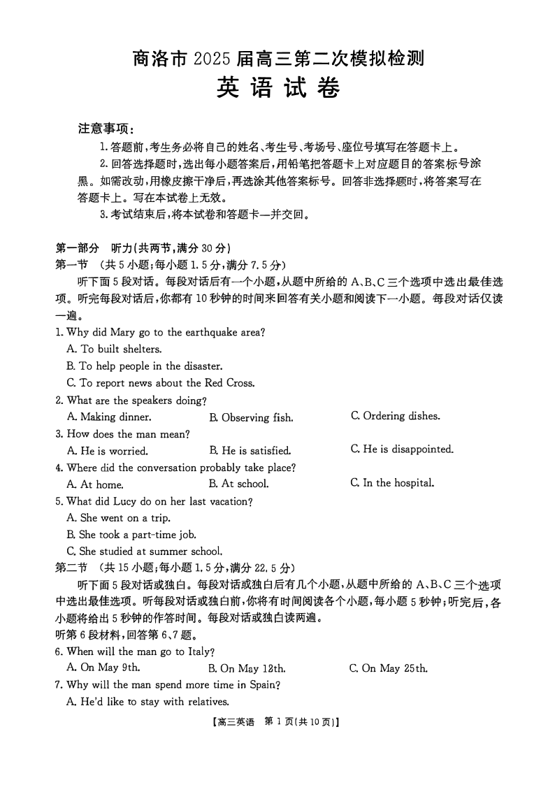 陕西省商洛市2024-2025学年下学期2月高三第二次模拟考试英语