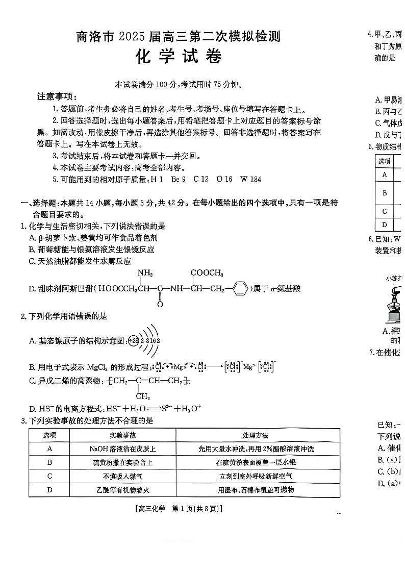 陕西省商洛市2024-2025学年下学期2月高三第二次模拟考试化学