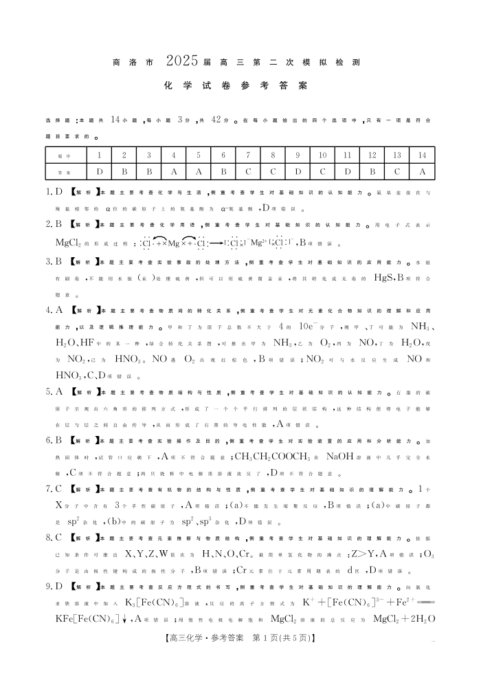 陕西省商洛市2024-2025学年下学期2月高三第二次模拟考试化学答案