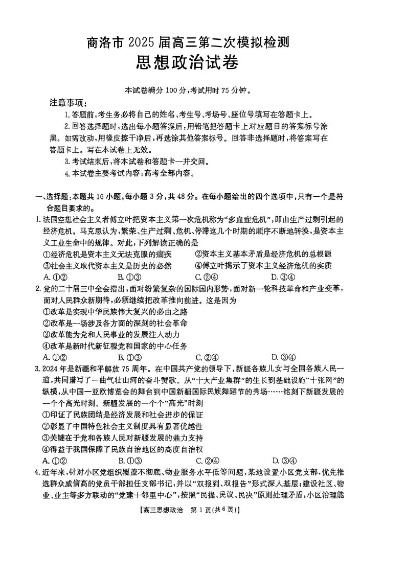 陕西省商洛市2024-2025学年下学期2月高三第二次模拟考试政治+答案