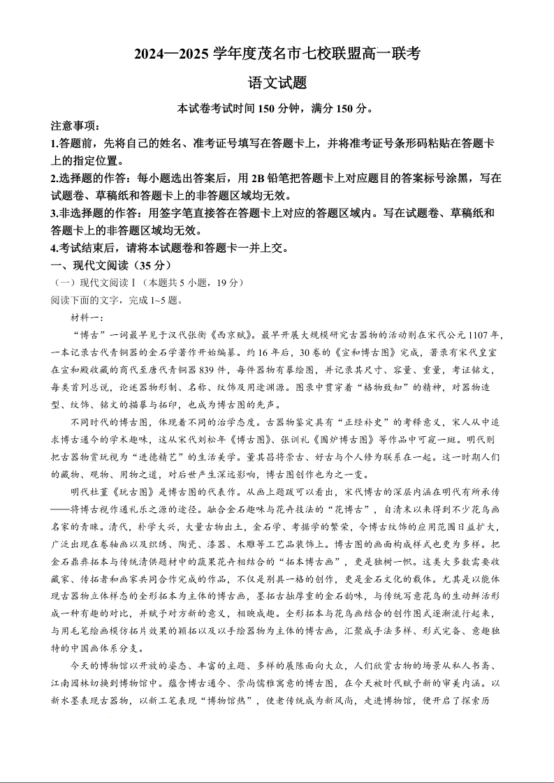 广东省茂名市七校2024-2025学年下学期2月高一月考语文+答案