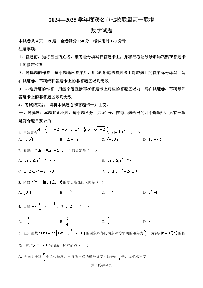 广东省茂名市七校2024-2025学年下学期2月高一月考数学(原卷版)