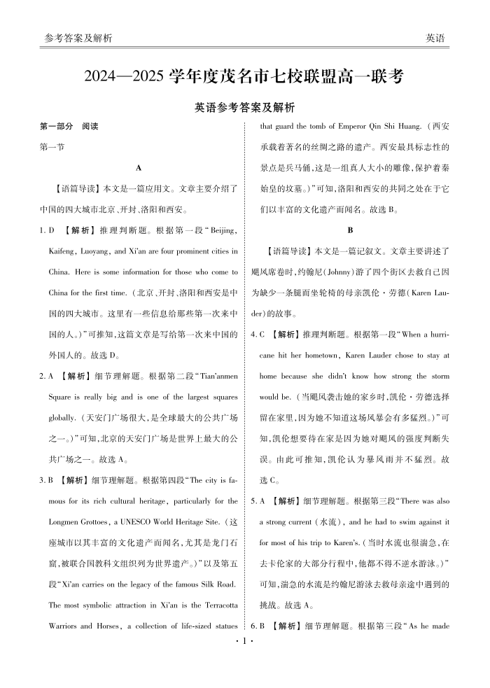 广东省茂名市七校2024-2025学年下学期2月高一月考英语答案