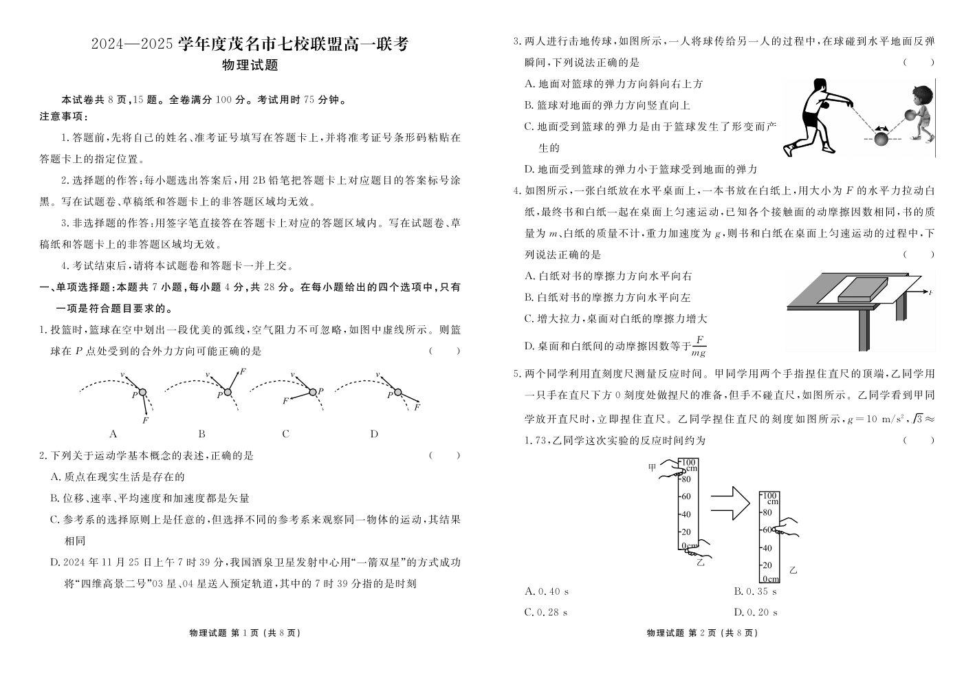 广东省茂名市七校2024-2025学年下学期2月高一月考物理