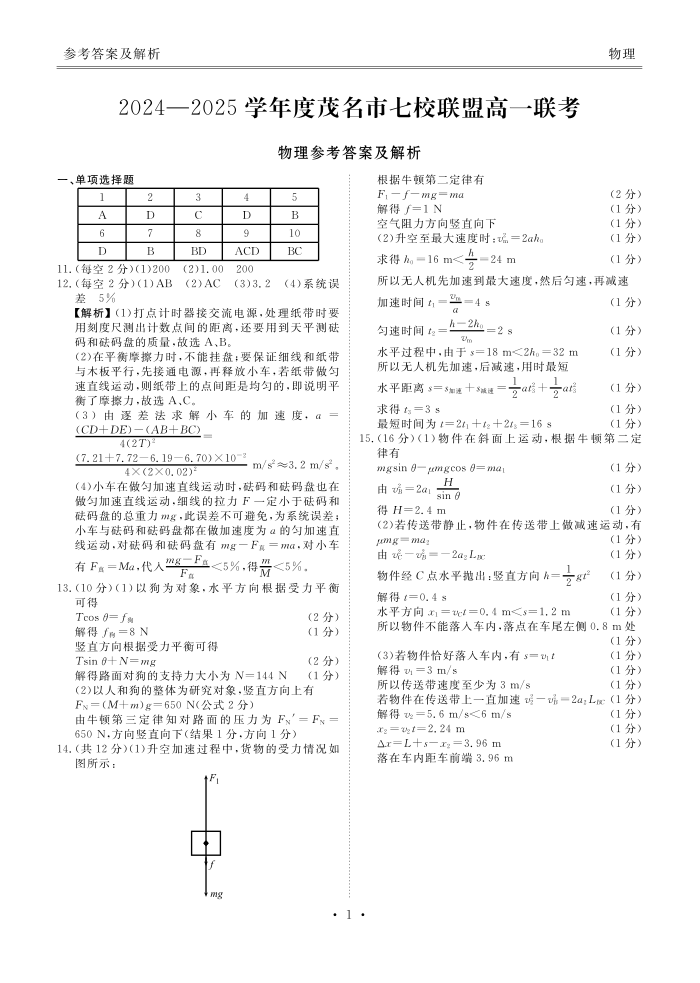 广东省茂名市七校2024-2025学年下学期2月高一月考物理答案