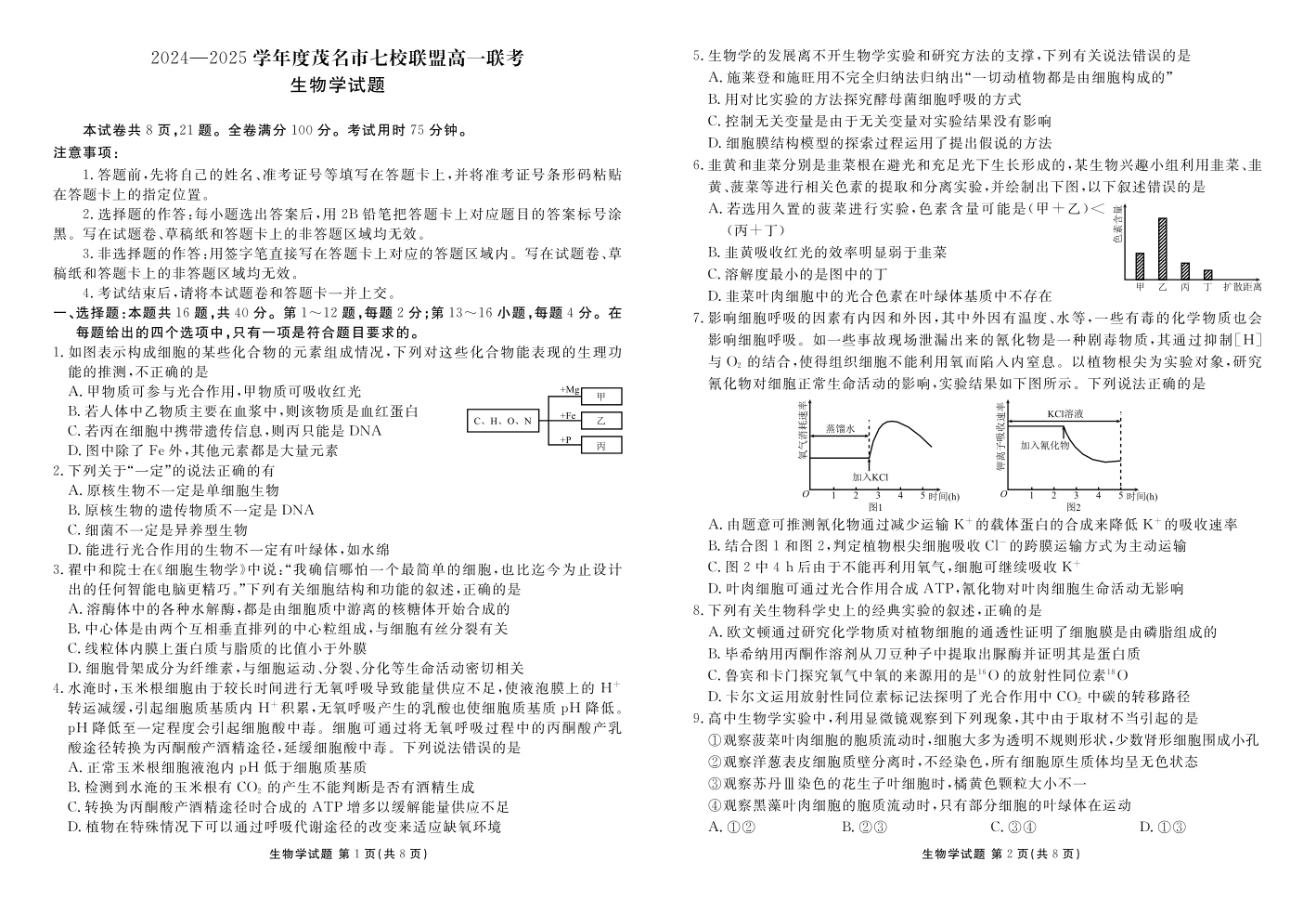 广东省茂名市七校2024-2025学年下学期2月高一月考生物