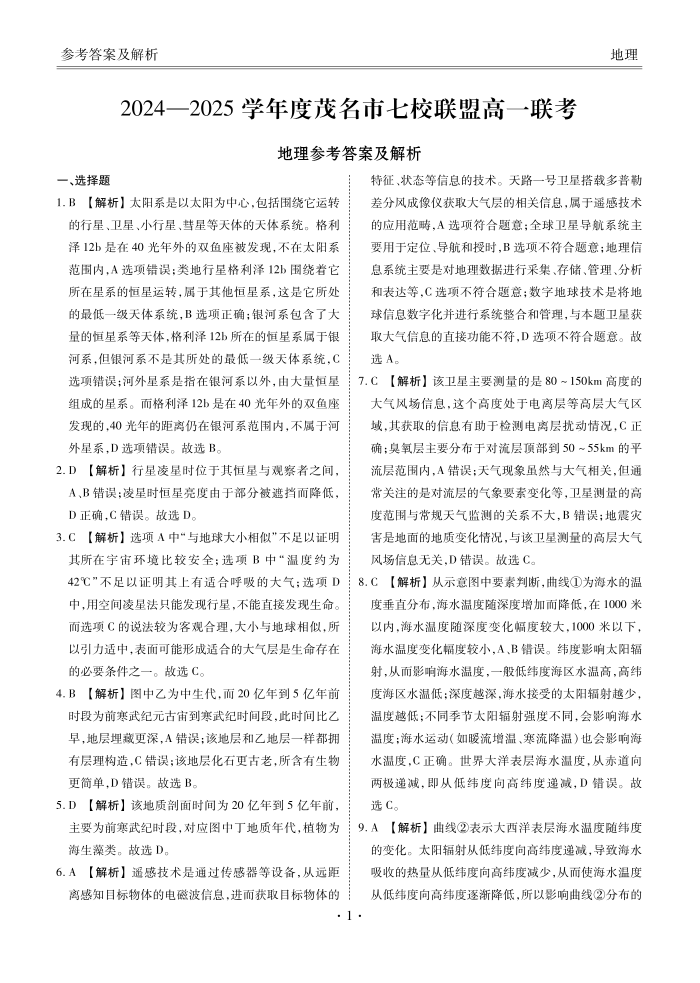 广东省茂名市七校2024-2025学年下学期2月高一月考地理答案