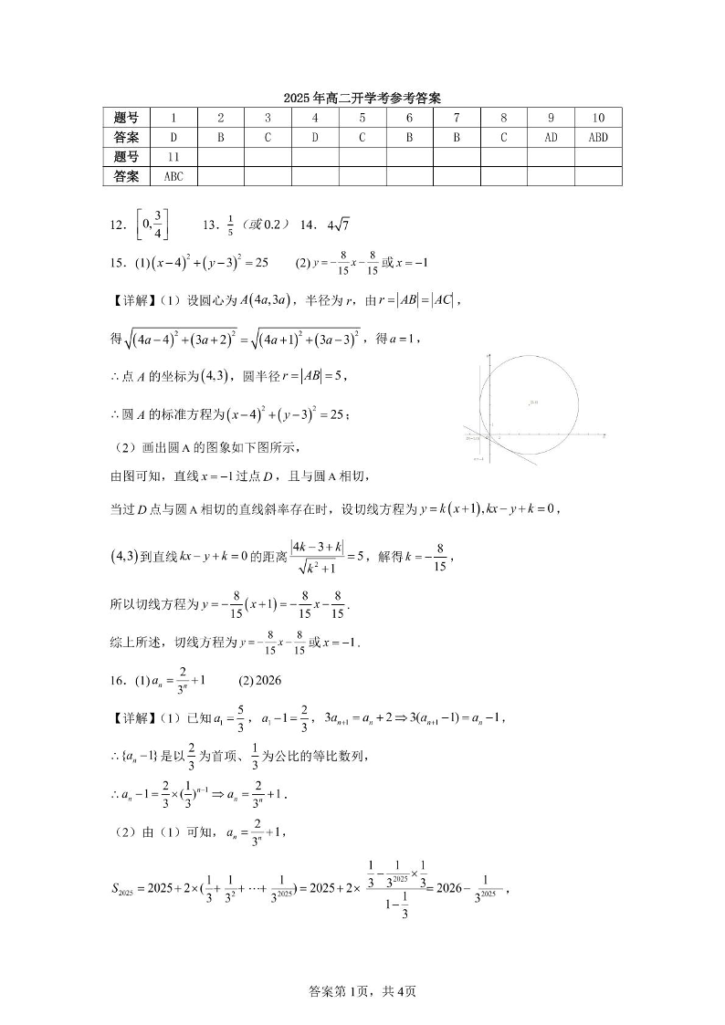 湖北省部分学校2024-2025学年下学期高二2月联考数学答案