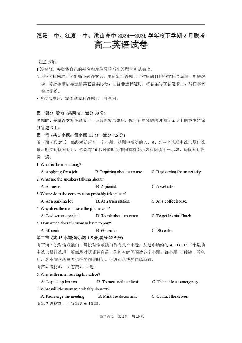 湖北省部分学校2024-2025学年下学期高二2月联考英语