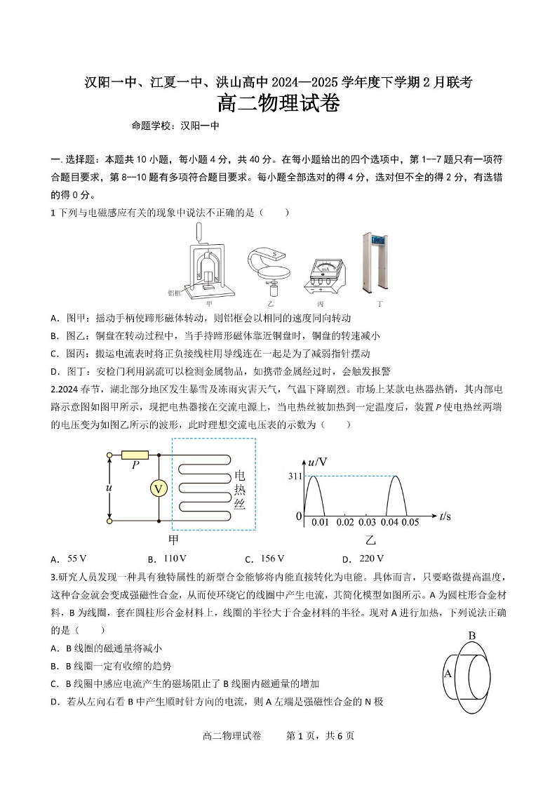 湖北省部分学校2024-2025学年下学期高二2月联考物理