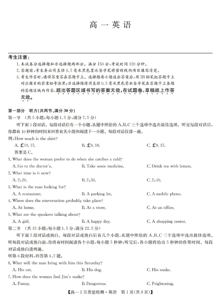 九师联盟2024-2025学年下学期2月高一质量检测英语+答案