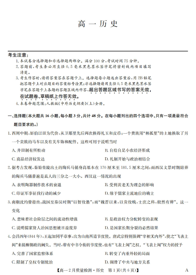 九师联盟2024-2025学年下学期2月高一质量检测历史+答案