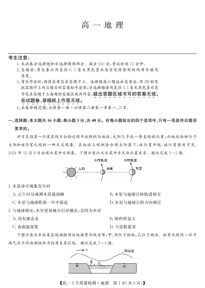 九师联盟2024-2025学年下学期2月高一质量检测地理+答案