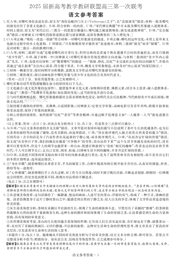 湖南省长郡二十校2024-2025学年下学期高三第一次联考语文答案
