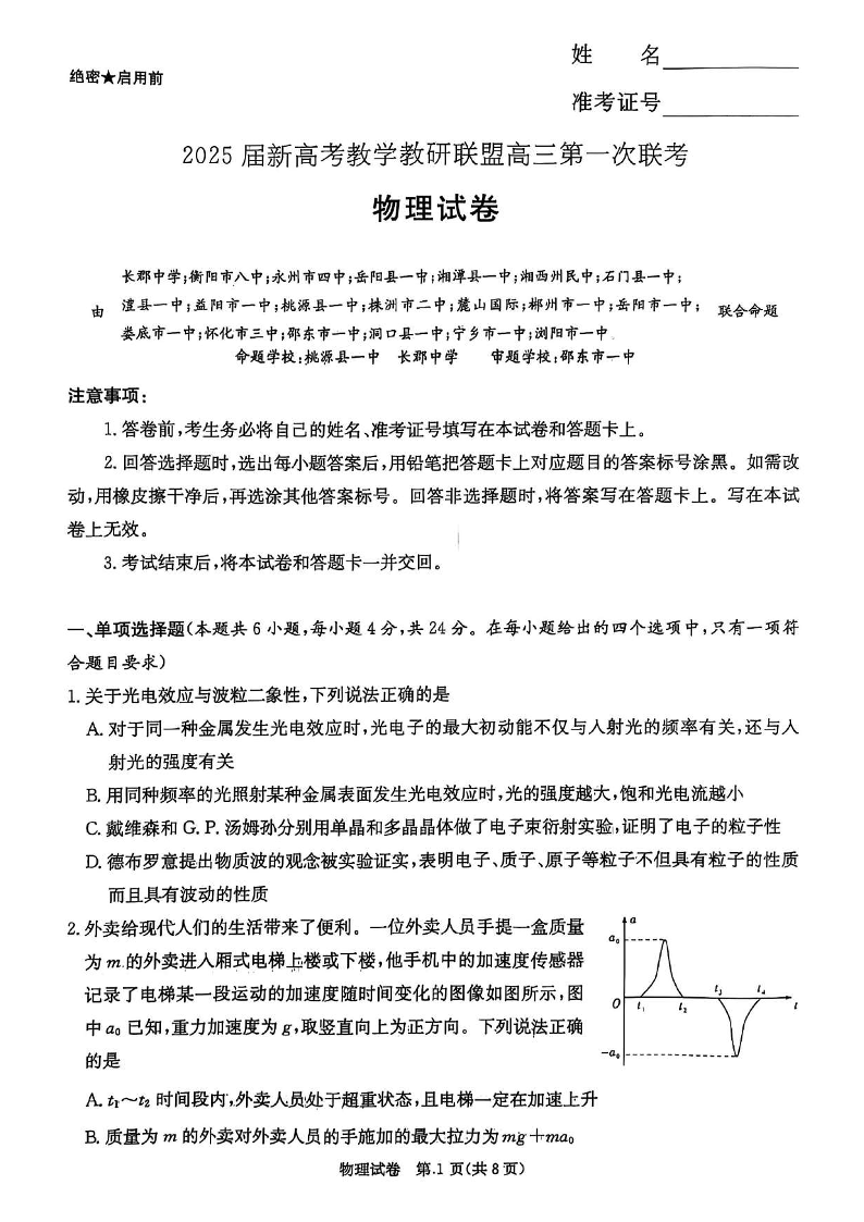 湖南省长郡二十校2024-2025学年下学期高三第一次联考物理