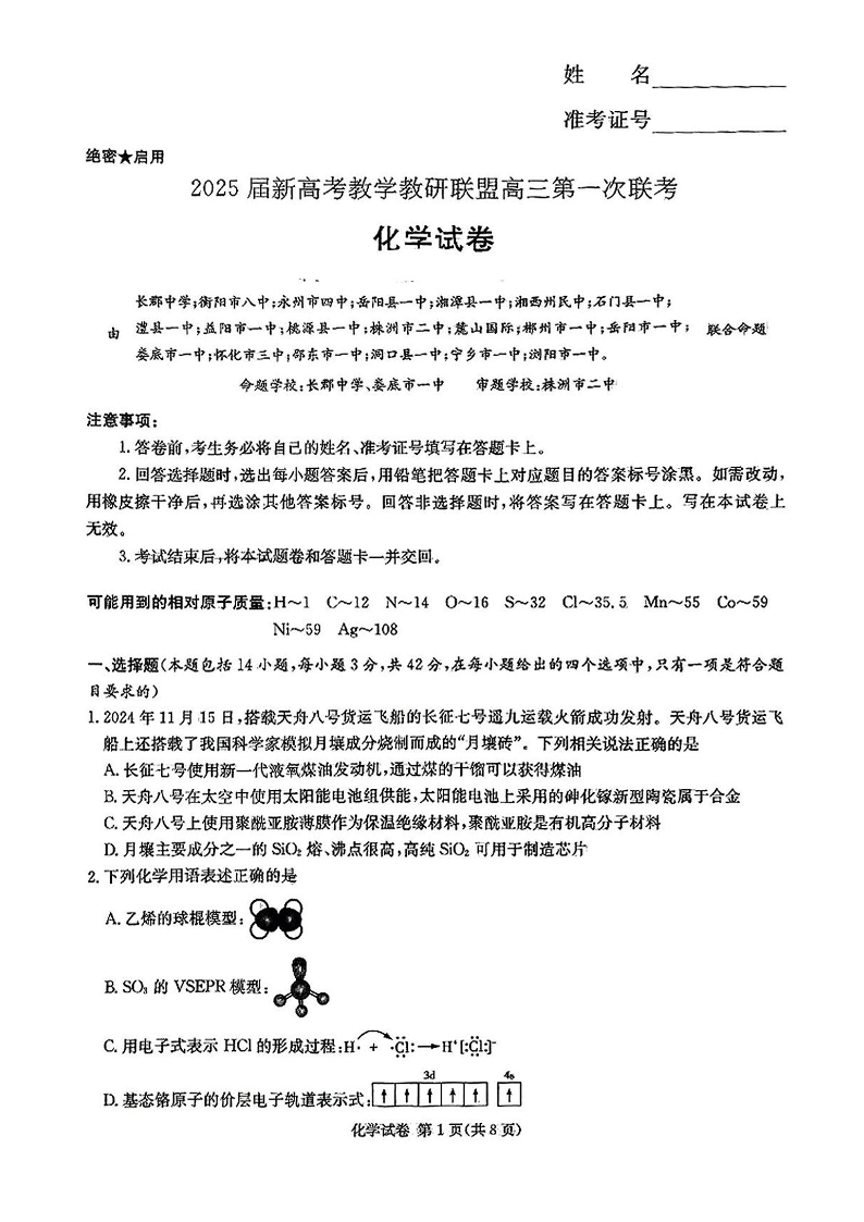 湖南省长郡二十校2024-2025学年下学期高三第一次联考化学+答案