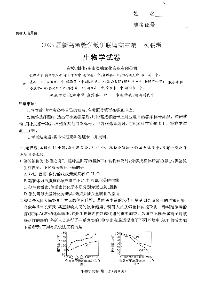 湖南省长郡二十校2024-2025学年下学期高三第一次联考生物