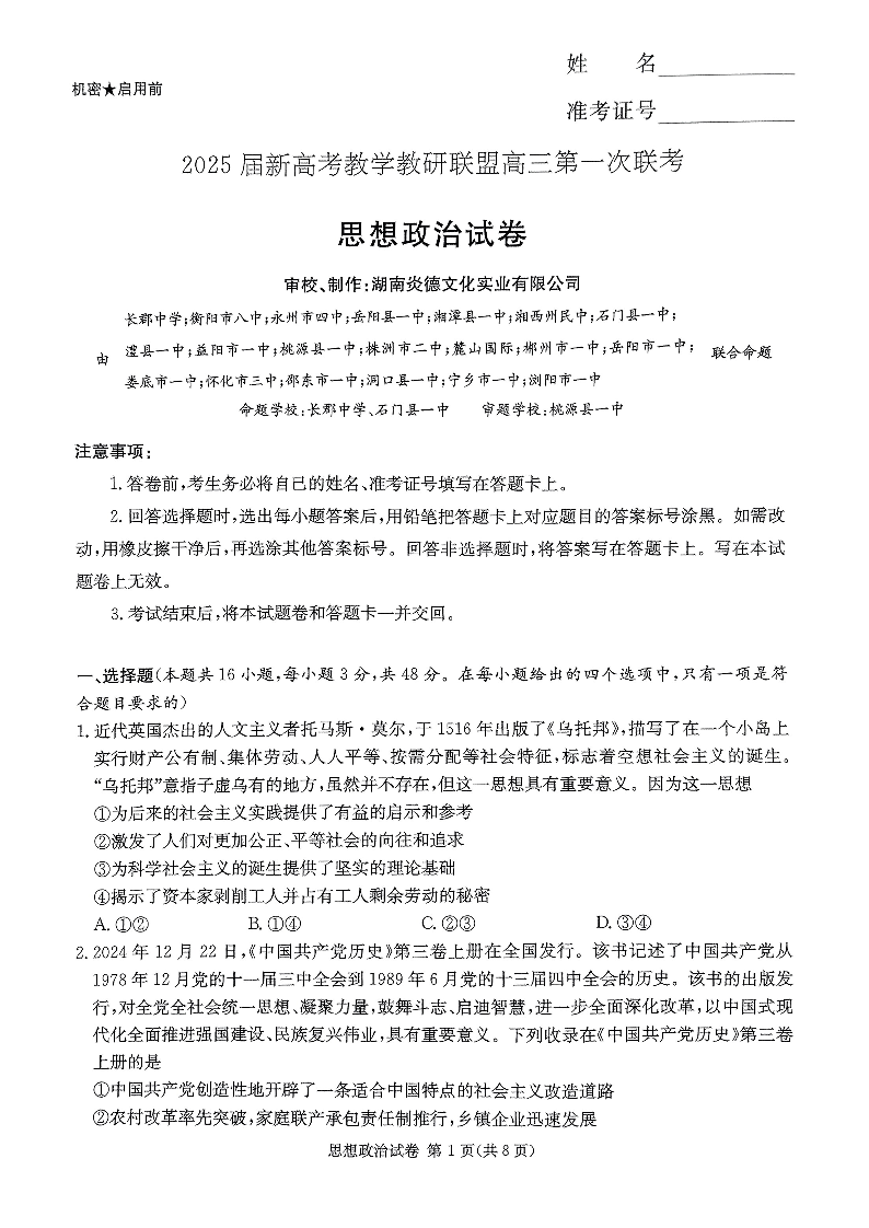 湖南省长郡二十校2024-2025学年下学期高三第一次联考政治