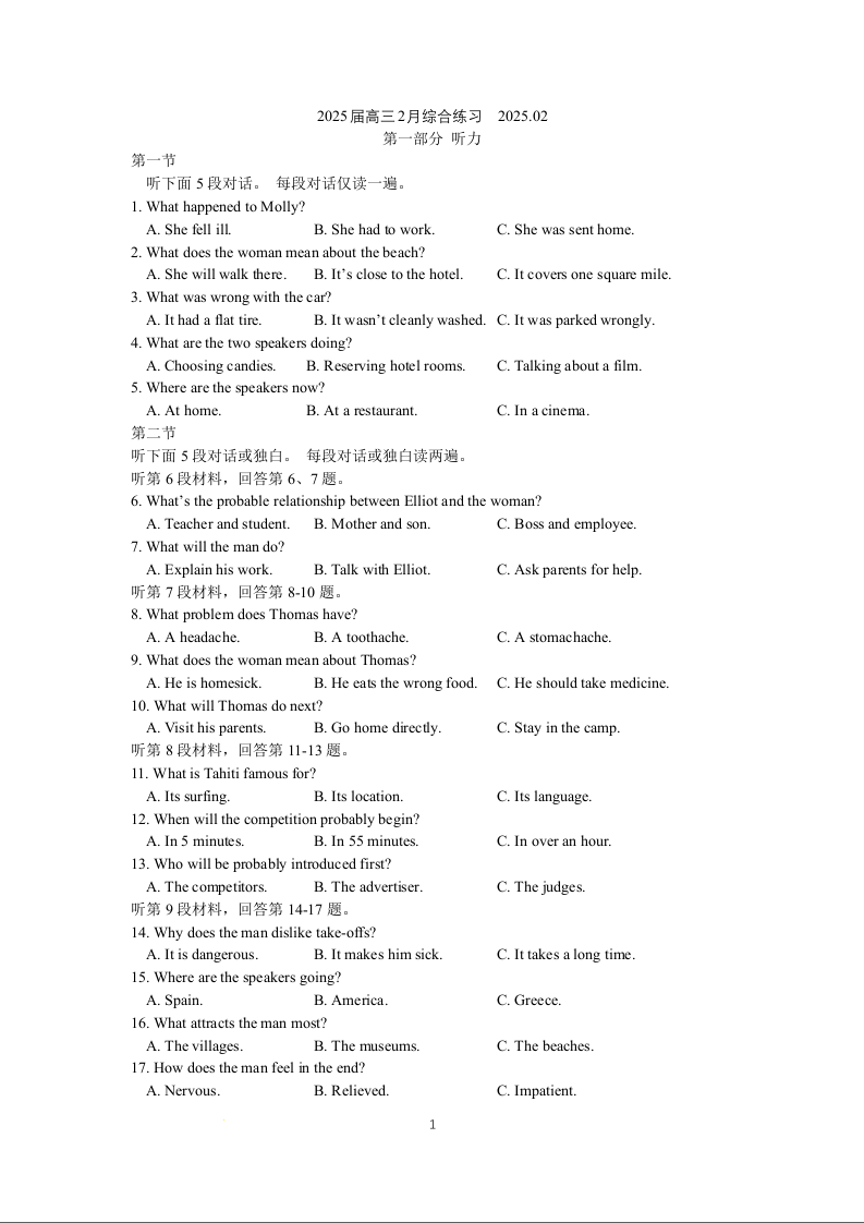 江苏省锡山高级中学2024-2025学年下学期2月高三综合练习英语+答案