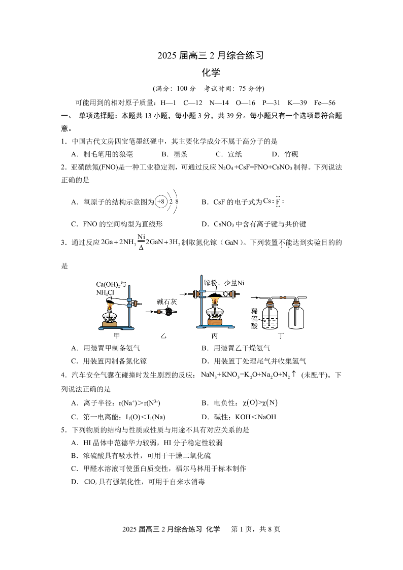 江苏省锡山高级中学2024-2025学年下学期2月高三综合练习化学+答案