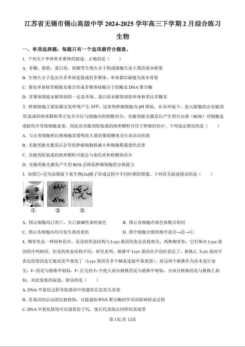 江苏省锡山高级中学2024-2025学年下学期2月高三综合练习生物