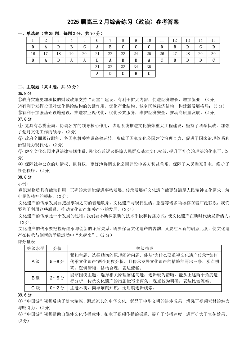 江苏省锡山高级中学2024-2025学年下学期2月高三综合练习政治答案