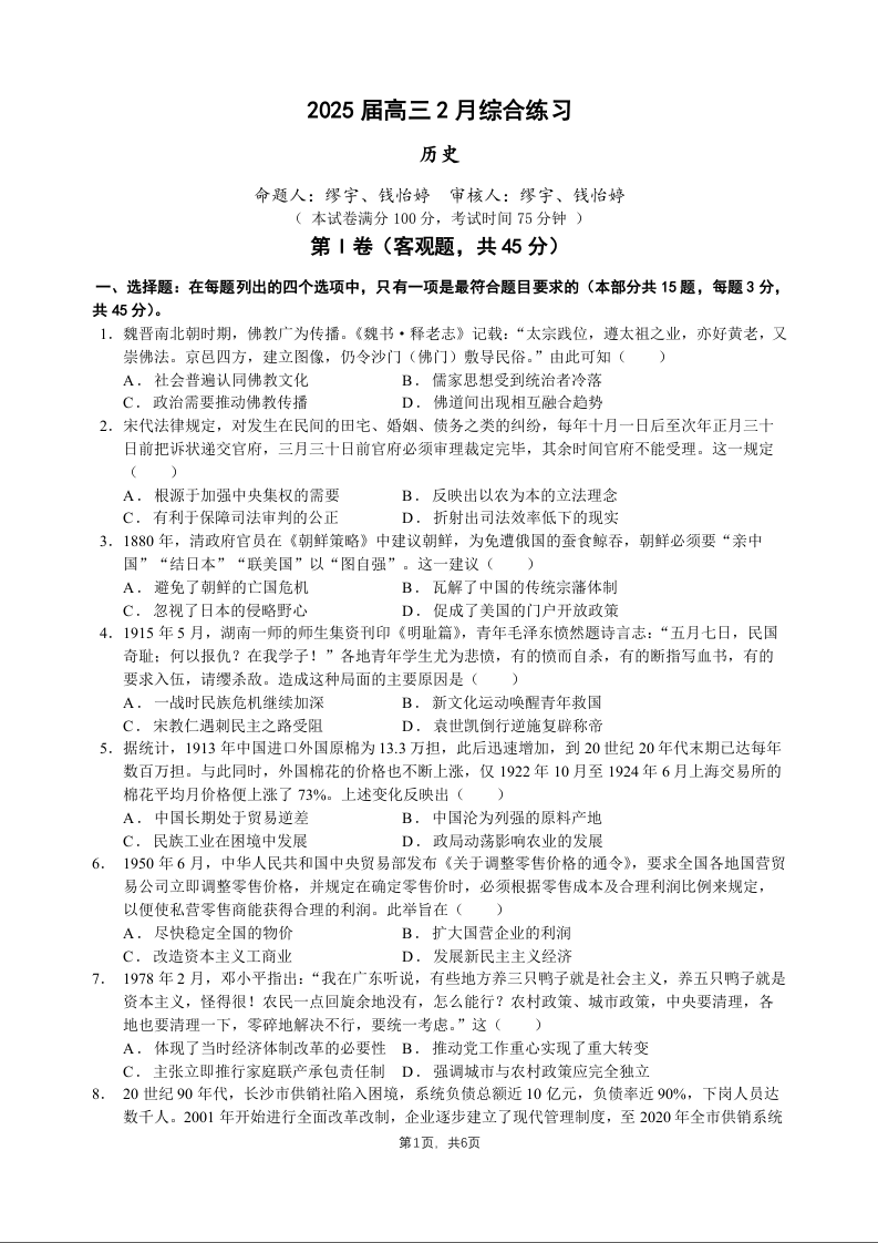 江苏省锡山高级中学2024-2025学年下学期2月高三综合练习历史