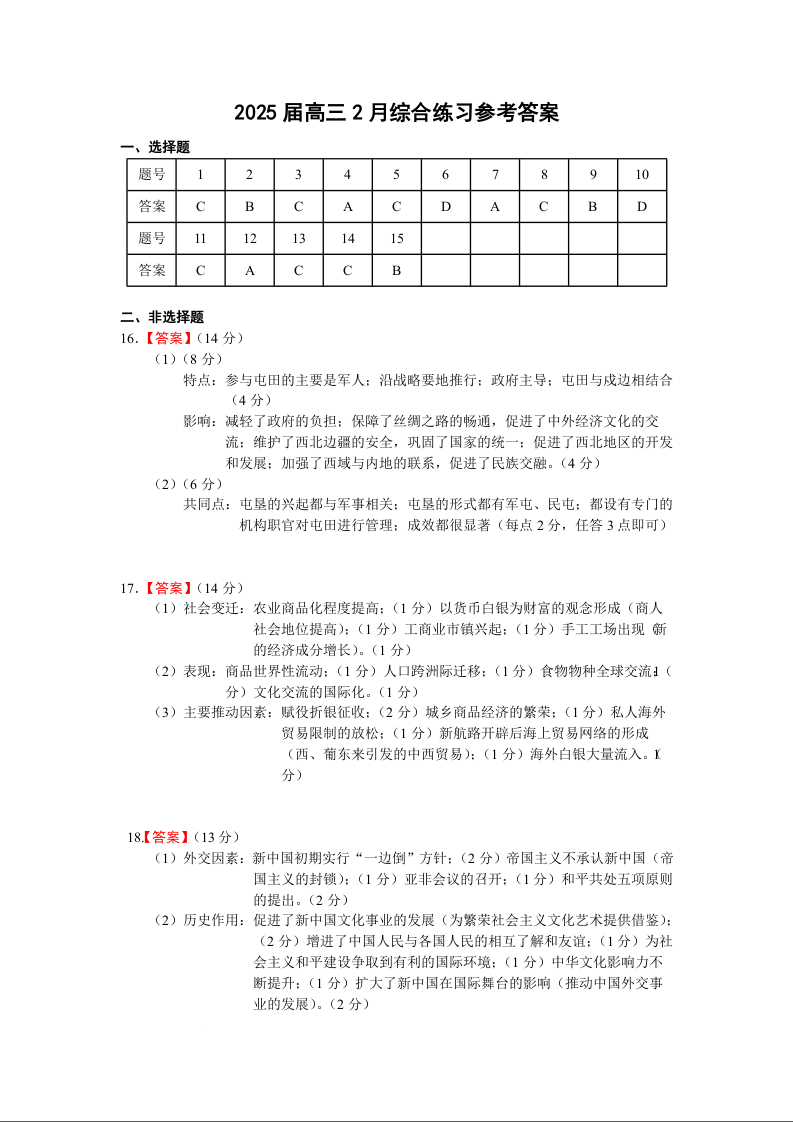江苏省锡山高级中学2024-2025学年下学期2月高三综合练习历史答案