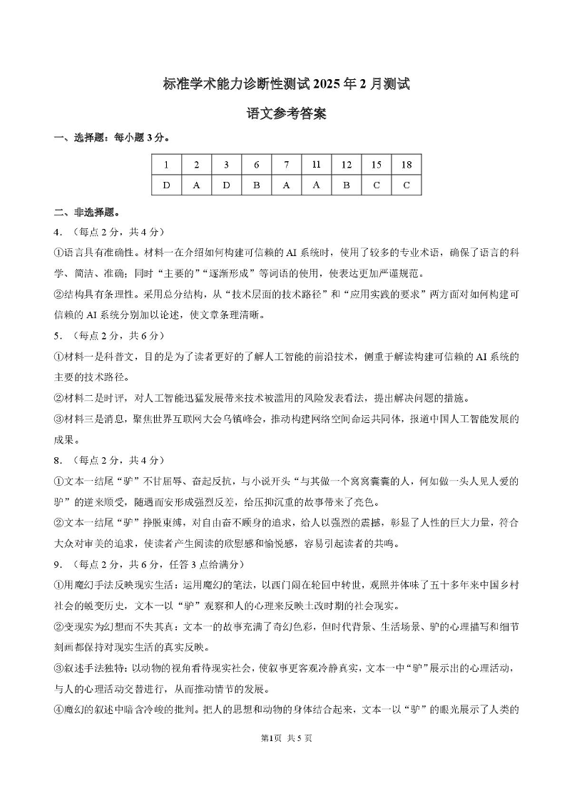 标准学术能力诊断性测试2024-2025学年下学期2月测试语文答案