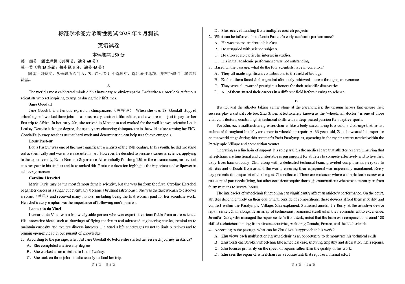 标准学术能力诊断性测试2024-2025学年下学期2月测试英语