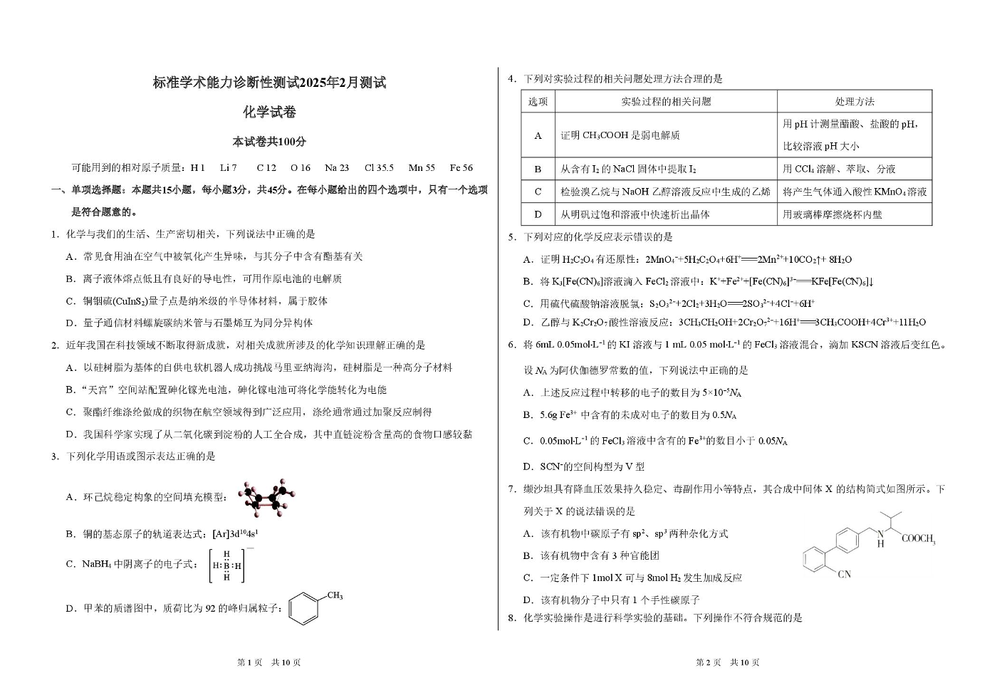 标准学术能力诊断性测试2024-2025学年下学期2月测试化学