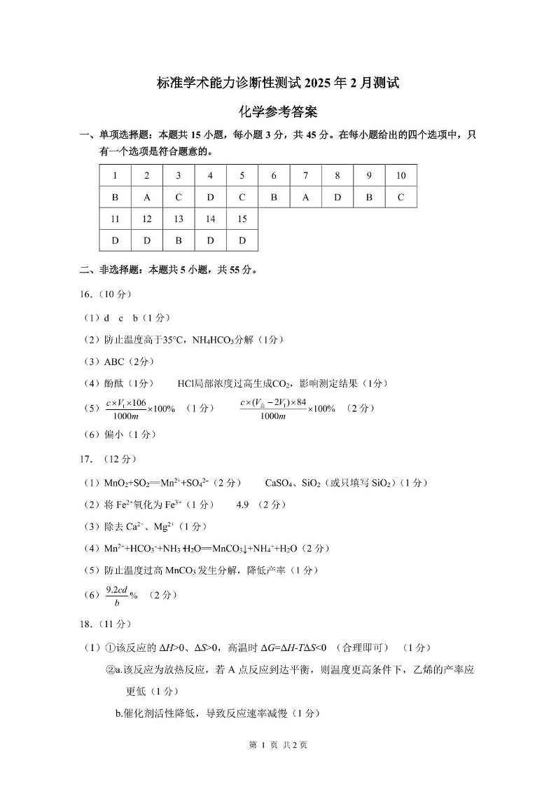 标准学术能力诊断性测试2024-2025学年下学期2月测试化学答案