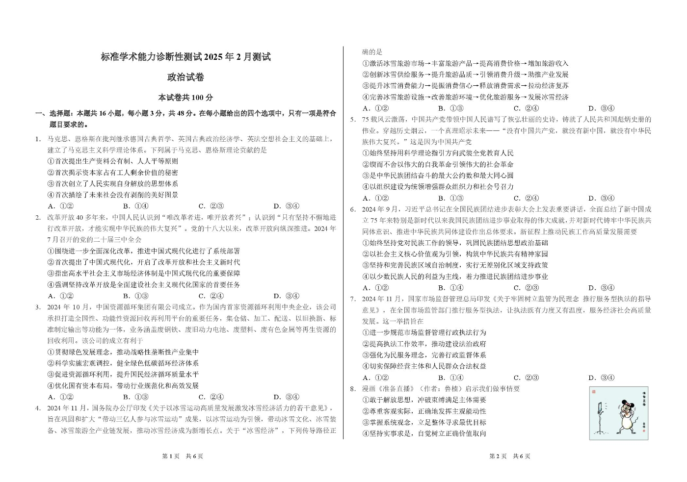 标准学术能力诊断性测试2024-2025学年下学期2月测试政治