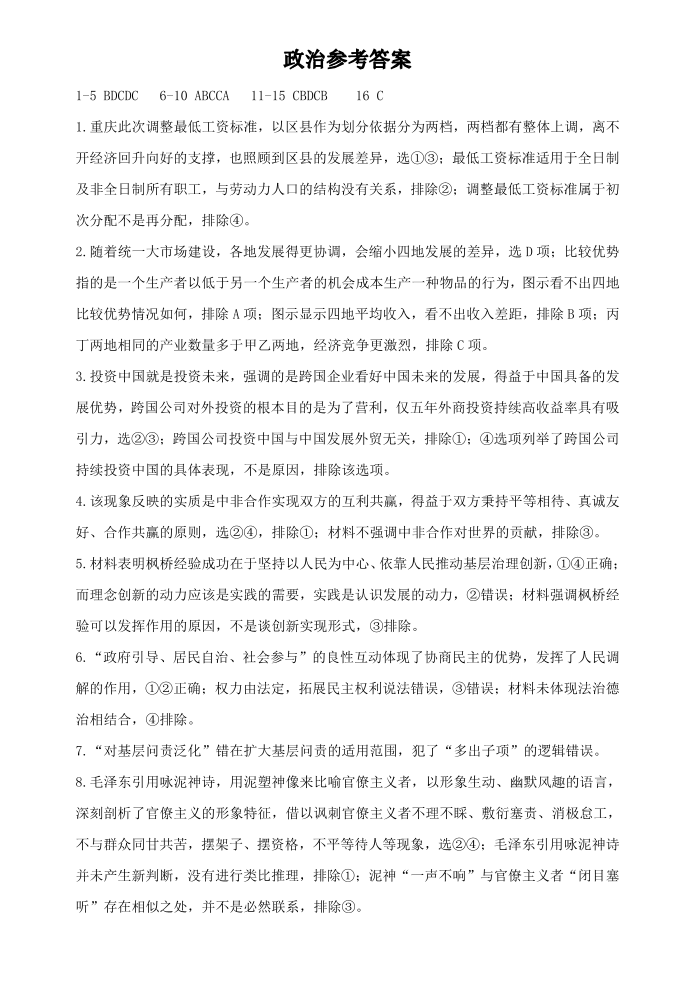 重庆市第八中学2024-2025学年下学期高三高考适应性月考(五)政治答案
