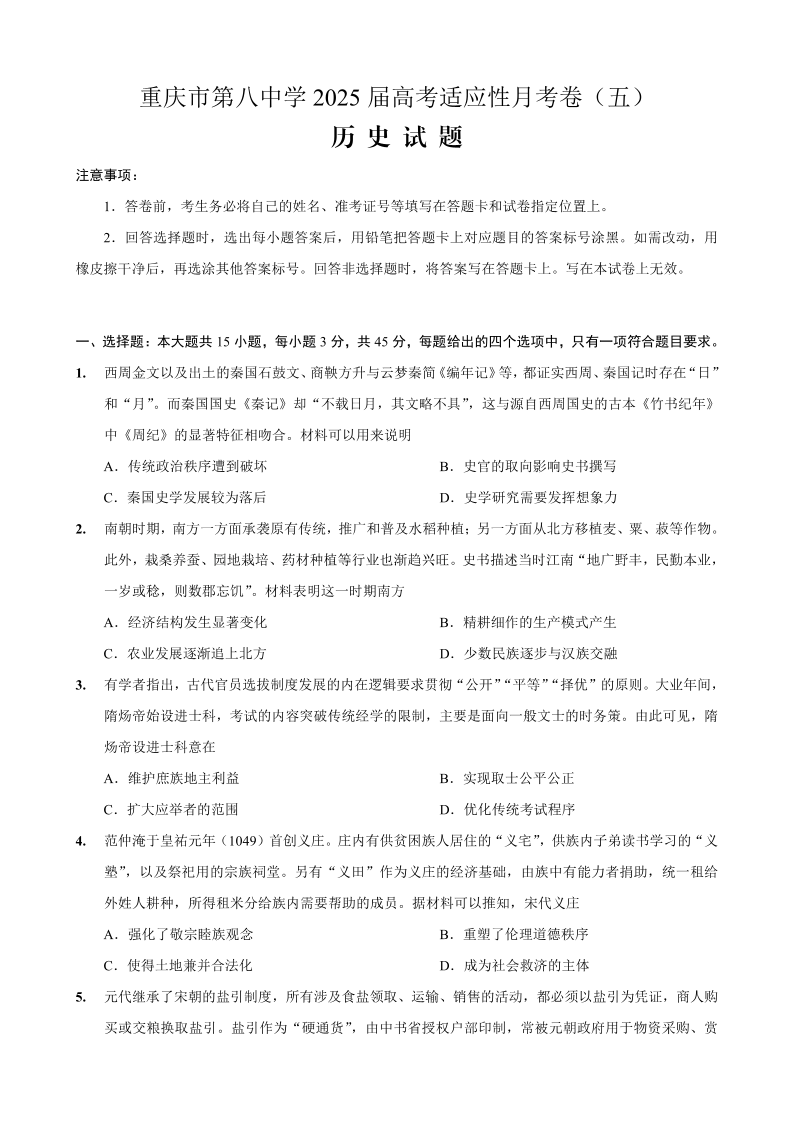 重庆市第八中学2024-2025学年下学期高三高考适应性月考(五)历史
