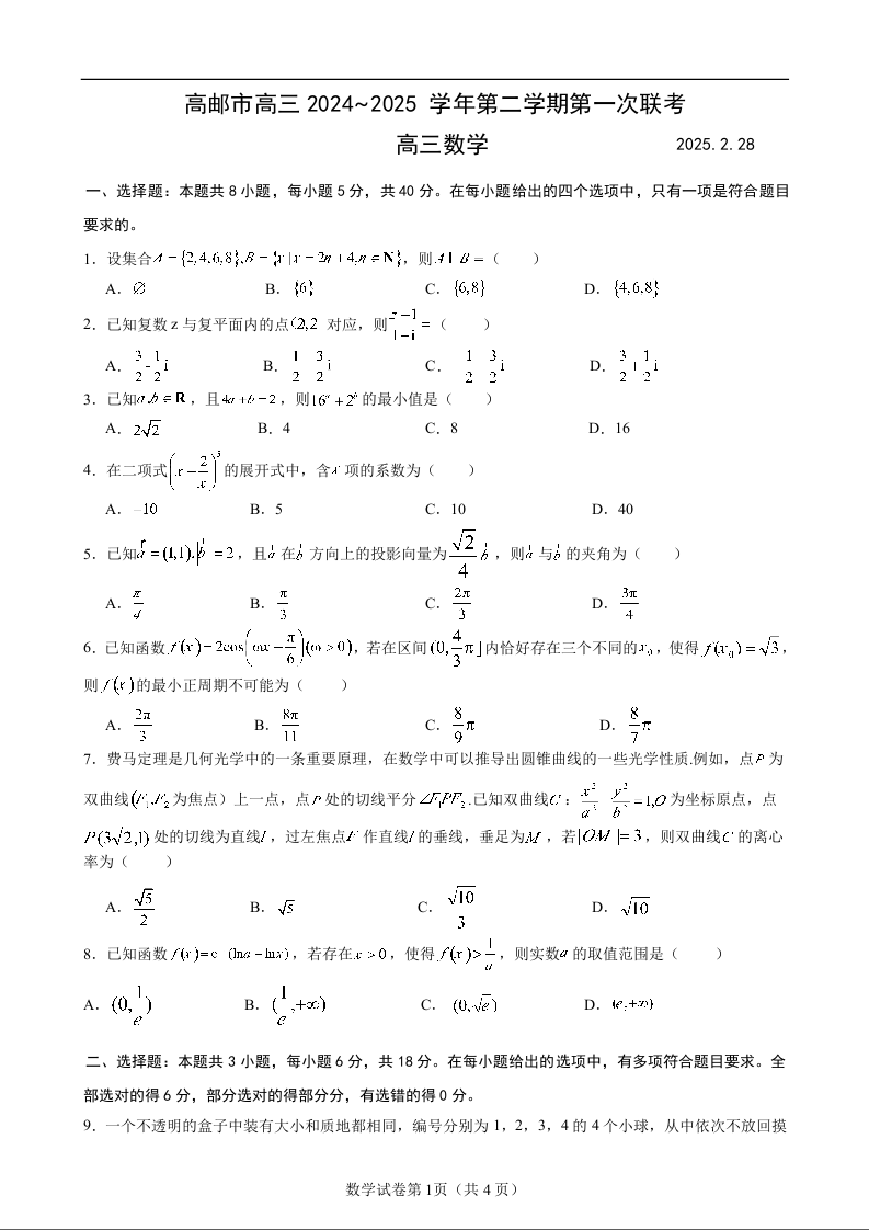 江苏省高邮市2024-2025学年下学期2月高三第一次联考数学数学