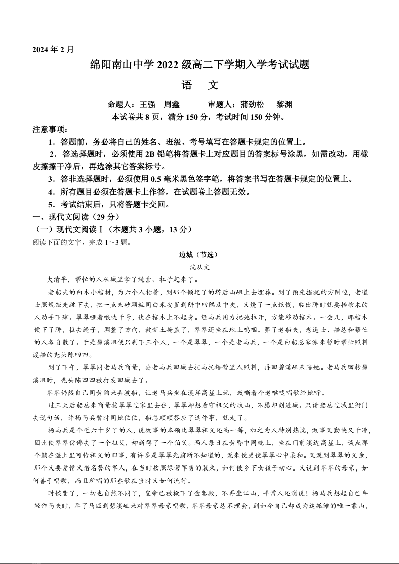 四川省绵阳市南山中学2023-2024学年高二下学期入学考试语文+答案