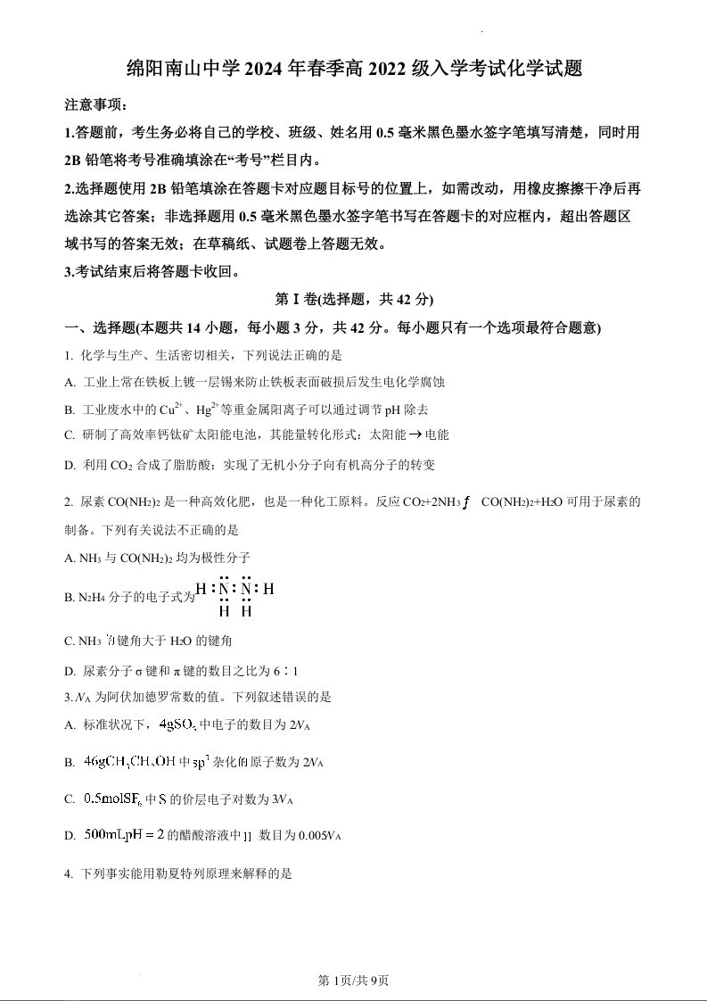 四川省绵阳市南山中学2023-2024学年高二下学期入学考试化学(原卷版)