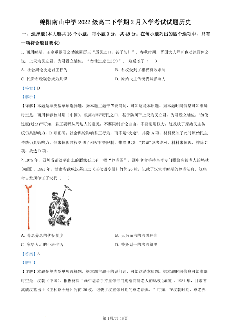 四川省绵阳市南山中学2023-2024学年高二下学期入学考试历史(精品解析版)