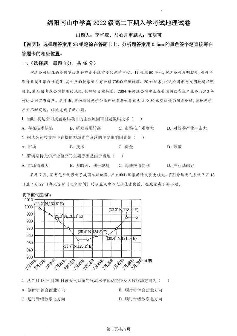 四川省绵阳市南山中学2023-2024学年高二下学期入学考试地理(原卷版)