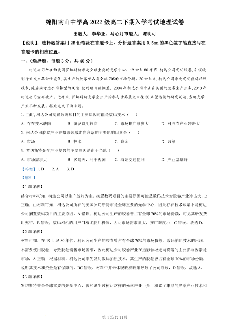 四川省绵阳市南山中学2023-2024学年高二下学期入学考试地理(精品解析版)