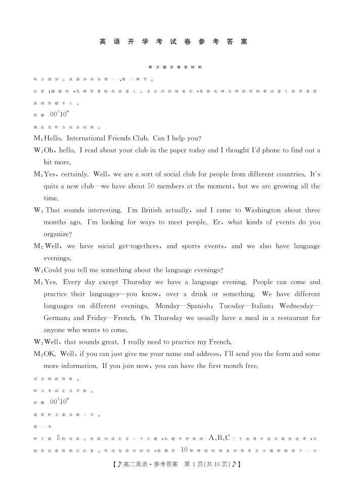 四川省雅安市部分学校2023-2024学年高二下学期入学联考英语答案