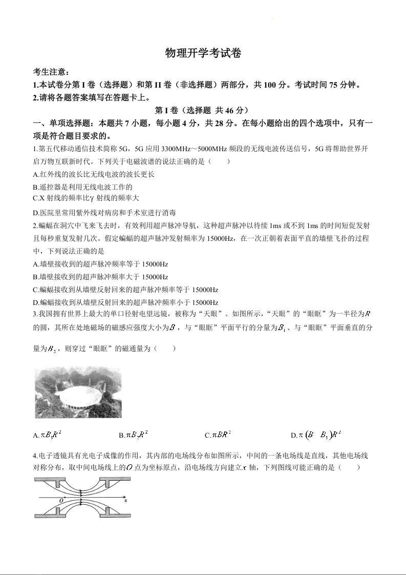 四川省雅安市部分学校2023-2024学年高二下学期入学联考物理+答案