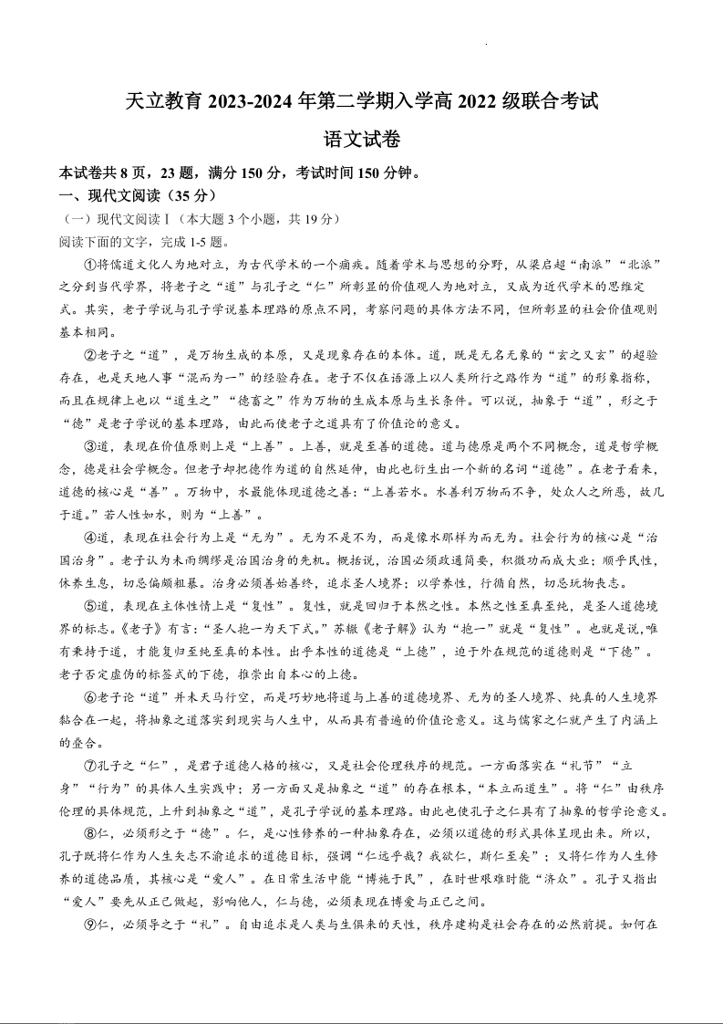 四川省雅安市天立教育集团2023-2024学年高二下学期开学考试语文+答案