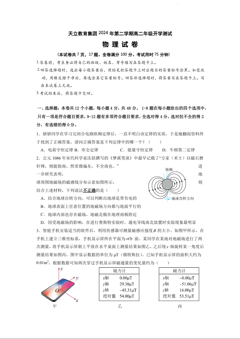 四川省雅安市天立教育集团2023-2024学年高二下学期开学考试物理+答案