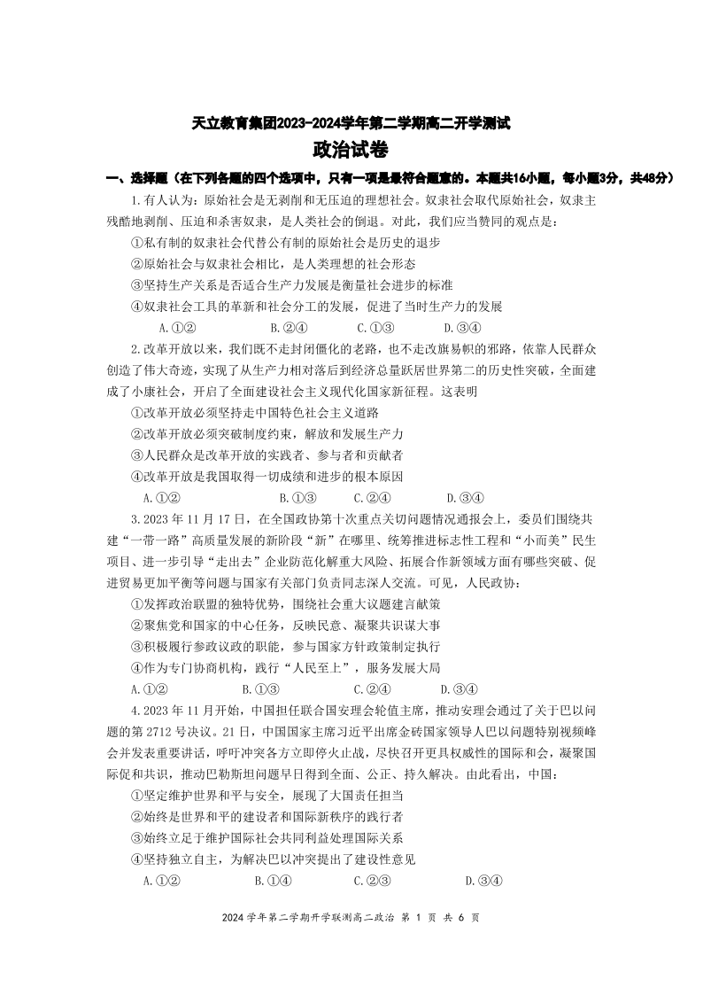 四川省雅安市天立教育集团2023-2024学年高二下学期开学考试政治+答案