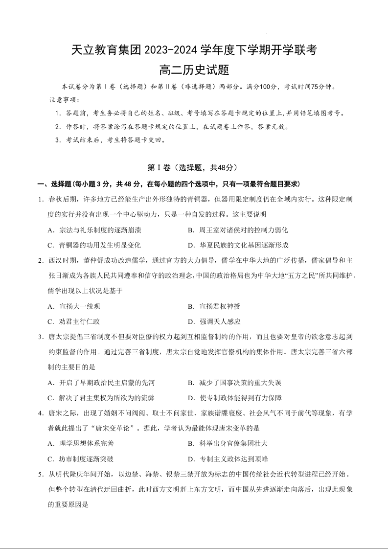 四川省雅安市天立教育集团2023-2024学年高二下学期开学考试历史+答案