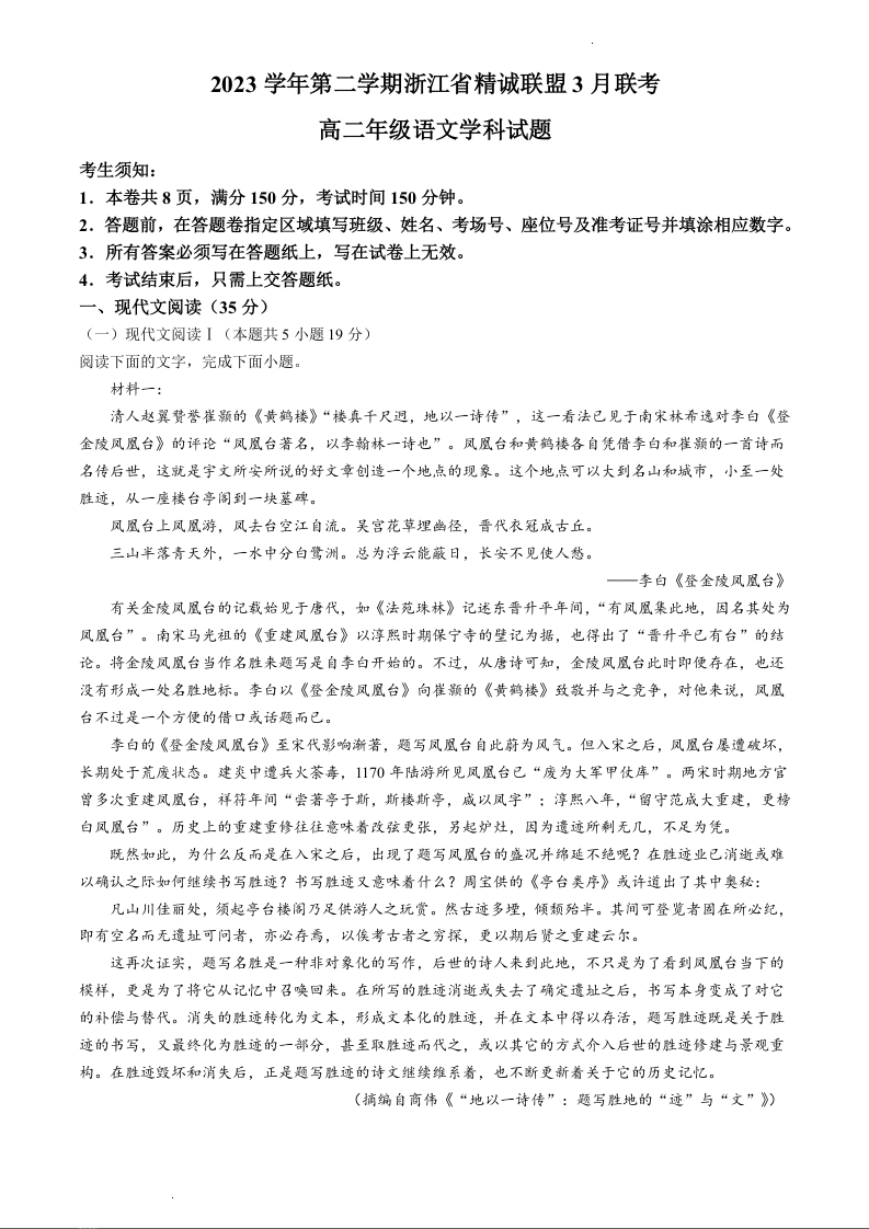 浙江省精诚联盟2023-2024学年高二下学期3月联考语文+答案